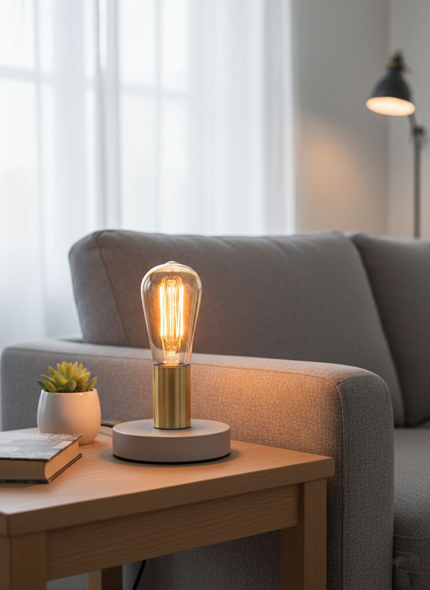 עיצוב מינימליסטי: גוף קטן ללא אהיל, שאינו תופס מקום רב אך בעל נוכחות ויזואלית חזקה.